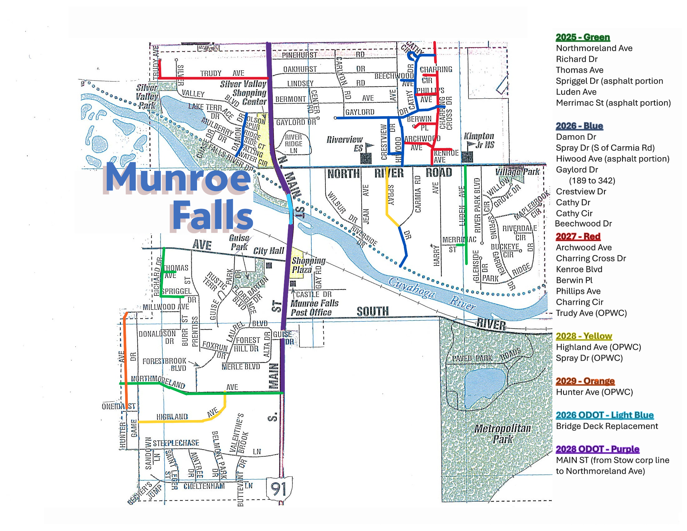 The City has developed a tentative 5-year Street Improvement Plan. This color coded map includes projected improvements to Main St (Rt. 91) by ODOT in 2028 and the bridge deck replacement over the Cuyahoga River by ODOT in 2026. Click here to view the map.